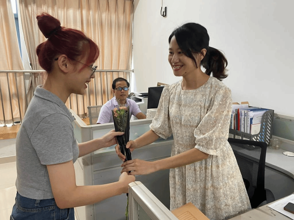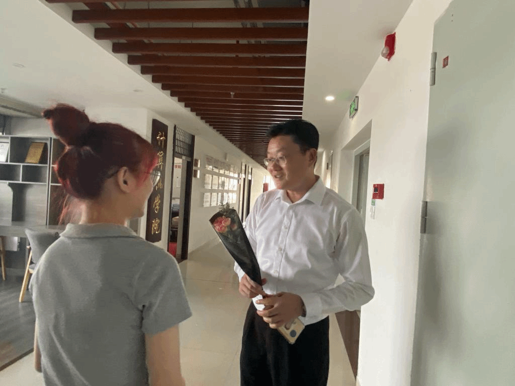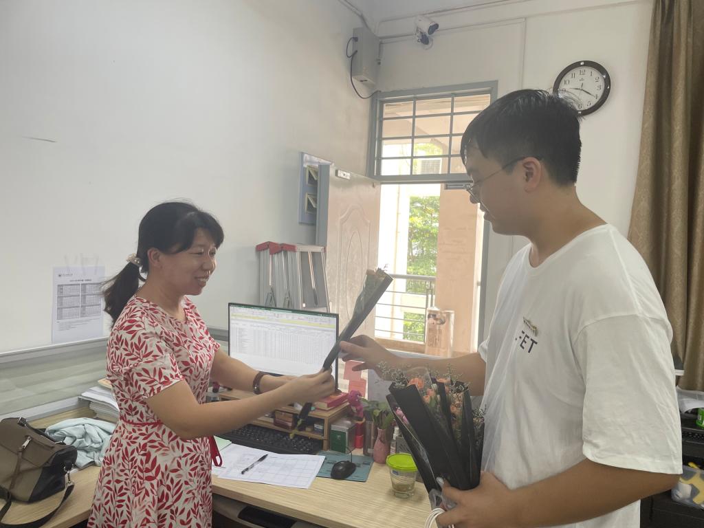 金秋九月,是一个满载收获的季节,也是一个充满感恩的季节。今年的教师节恰巧与传统的中秋节牵手相逢,给节日更添一抹喜庆的色彩。砺志楼213随着下课铃声的响起充满生机,员工代表心怀感恩、手捧鲜花,为孜孜不倦、幸福洋溢的老师们送上鲜花并进行交谈。