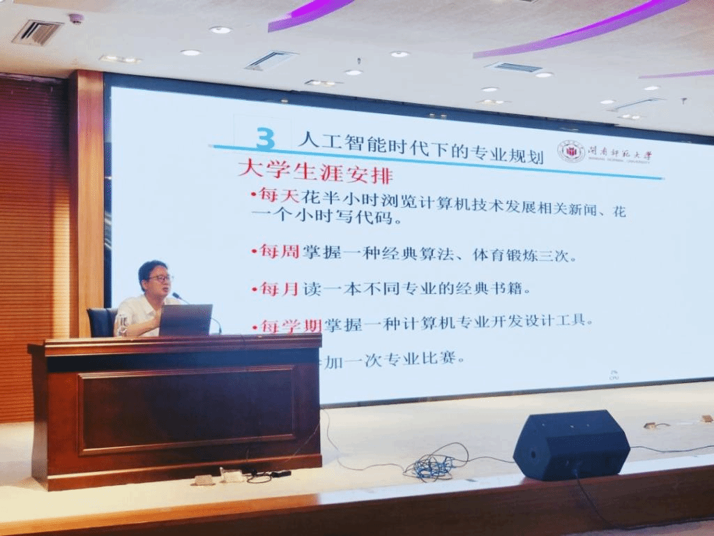 课堂上,林耀进经理围绕人工智能时代下的社会需求、隐私保护、专业规划三大方面,剖析人工智能时代下计算机专业人才应有的定位,期望同学们在大学里坚持学习,合理规划,鼓励同学们努力成为堪当强国重任的时代新人。
