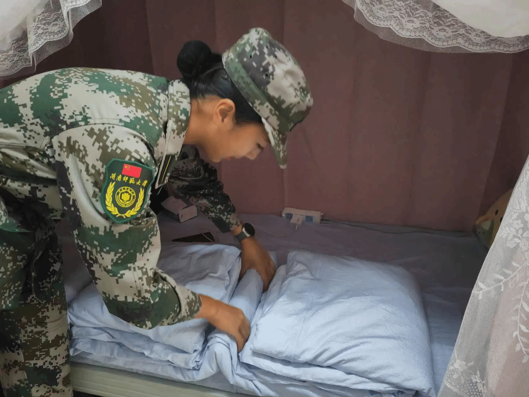 督察队员们以“手把手”的方式,耐心细致地介绍内务整理规范与技巧,让新生们自己动手参与内务整理,切身体会细节之处见真章,帮助新生们养成自律良好的生活习惯。