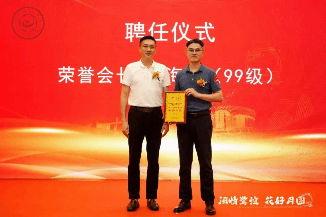 ▲母校员工会会长陈志宏为荣誉会长黄海良颁发聘书