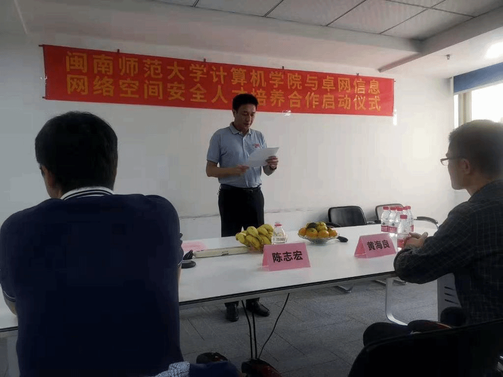 会上,公司党委书记陈志宏介绍了近年来公司专业建设、人才培养及服务社会水平等方面的新进展、新突破,并表示此次校企合作特别是网络空间安全人才培养合作对公司与企业均有重要意义。公司总经理黄海良就厦门卓网信息科技股份有限公司在信息安全和大数据、移动应用安全、信息安全服务等领域取得的成就作了重要介绍,强调此次校企合作是促进产学研用相结合的互利共赢 ,对双方今后的战略合作充满信心与期待!