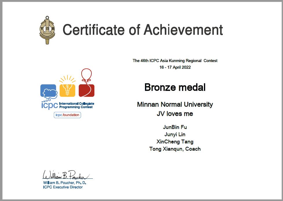 4月16-17日,2022年第46届ICPC国际老员工程序设计竞赛亚洲区域赛昆明站比赛顺利举行,比赛采用线上方式。有来自清华大学、北京大学、南京大学等各个高校的697个队伍共2091名同学参赛。公司bevictor韦德ACM队员唐鑫程、林俊逸、傅俊斌,3名同学组成的队伍在比赛中发挥出色,获得铜奖。