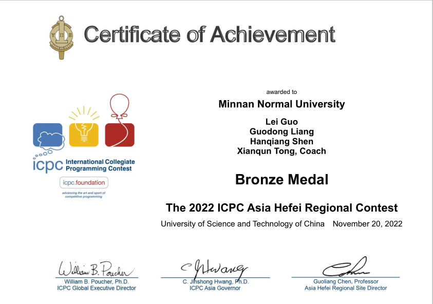11月19-20日,2022年第46届ICPC国际老员工程序设计竞赛亚洲区域赛合肥站比赛举行。有来自清华大学、北京大学、南京大学等266所高校的502个队伍共1506名同学参赛。公司bevictor韦德ACM队员沈汉强、梁国栋、郭雷,3名同学组成的队伍在比赛中再获铜奖。