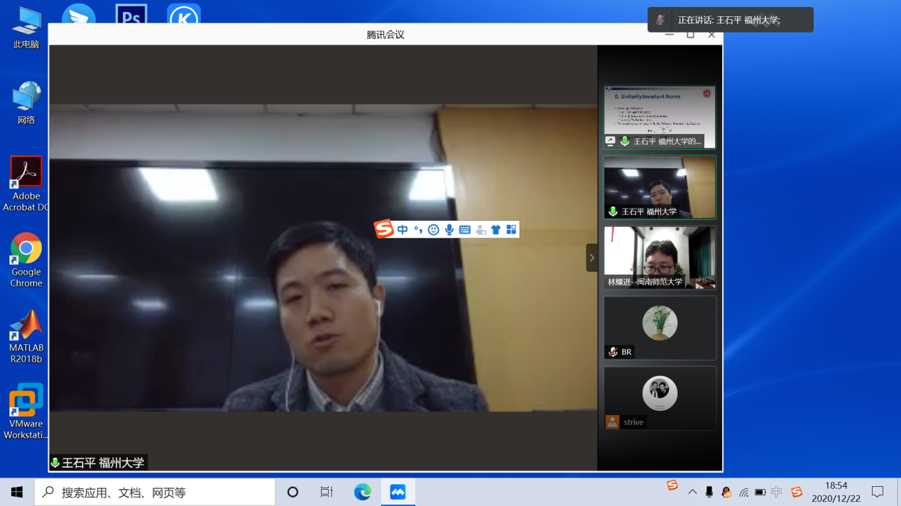 12月22日晚上,福州大学王石平教授应邀为公司师生作题为“Differentiable Distance Metric Learning and Low-rank Recovery(可微分的距离度量学习和低秩恢复)”的线上讲座,讲座由赵红老师主持,部分相关专业的老师及全体研究生出席并认真听取了本次讲座。