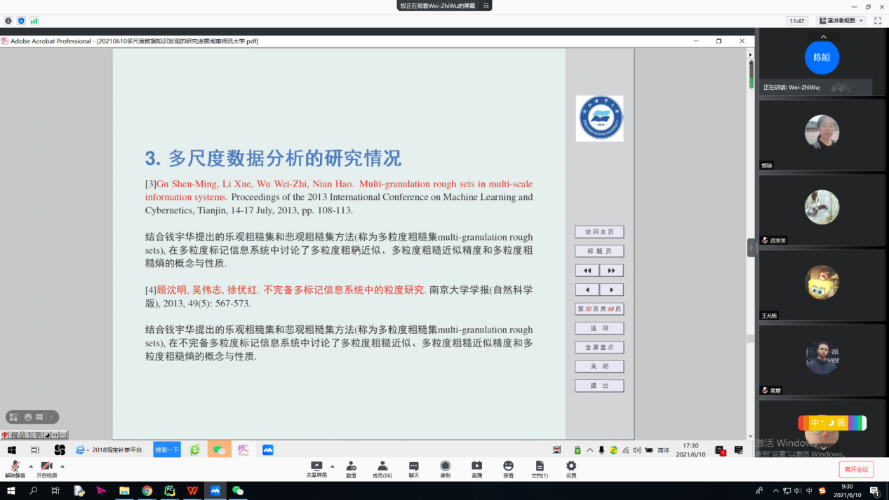 6月10日下午,浙江海洋大学吴伟志教授应邀为公司师生作题为“多尺度数据知识发现的研究进展”的线上专题讲座。讲座在林耀进经理和吴教授轻松的交谈中开始,林经理对吴教授的研究领域和相关研究成果进行了简单的介绍。