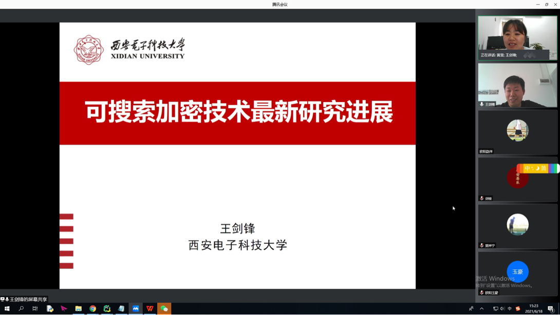 6月18日下午,西安电子科技大学网络与信息安全公司的王剑锋副教授应邀为公司师生作题为“可搜索加密技术最新研究进展”的线上专题讲座。讲座开始前,黄慧副经理和王老师就硕士生、博士生培养等相关内容进行了交流,对王副教授的科研领域和相关成果进行了简单介绍。