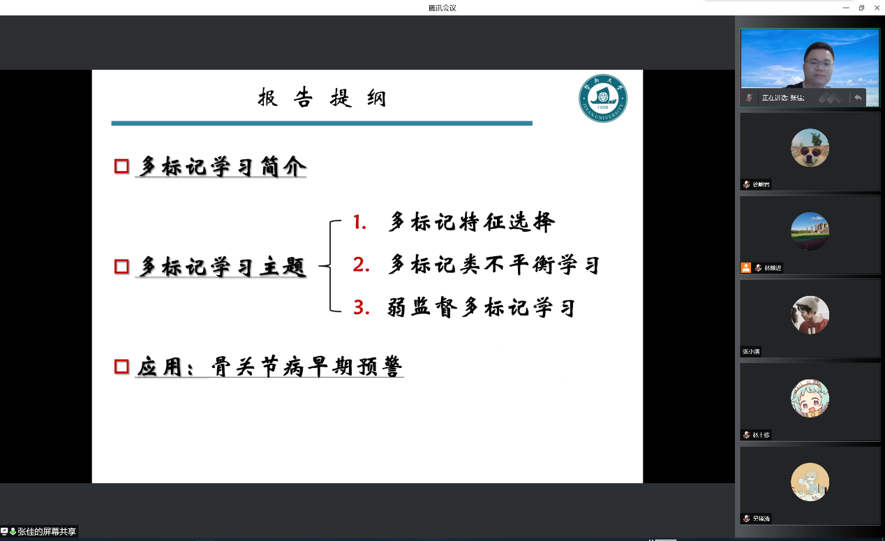 张教授首先介绍了多标记学习的一些储备知识,随后对近几年在多标记学习中的三个主要研究内容:多标记特征选择、多标记类不平衡学习和弱监督多标记学习展开详细讲解。期间,张教授介绍推荐了几种十分具有启发性的思路和方法供同学们参考和学习。此外,张教授还结合多标记学习的相关知识,跟同学们分享了它们在骨关节病早期预警等实际场景中的应用,为同学们提供了一些新的研究思路和展望。