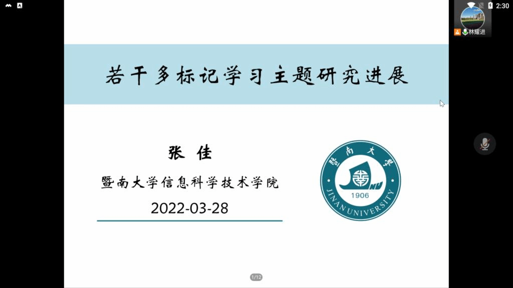 3月28日下午,暨南大学信息科学技术公司副教授张佳应邀为公司师生作题为“若干多标记学习主题研究进展 ”的线上专题报告。本次报告会由公司经理林耀进主持,林经理对张教授的科研领域和相关成果进行了简要介绍,随后邀请张教授进行本次报告。