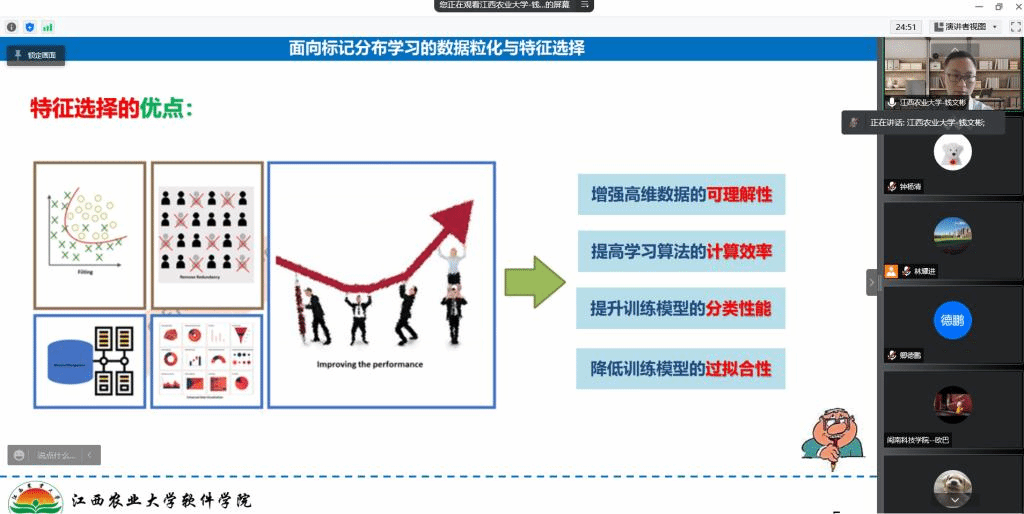 4月12日上午,江西农业大学软件公司钱文彬教授应邀为公司师生做题为“面向标记分布学习的数据粒化与特征选择”的线上专题报告。本次报告会由公司经理林耀进教授主持,林经理首先对钱教授的科研领域和相关成果进行了简要介绍,随后钱教授开始本次专题报告。