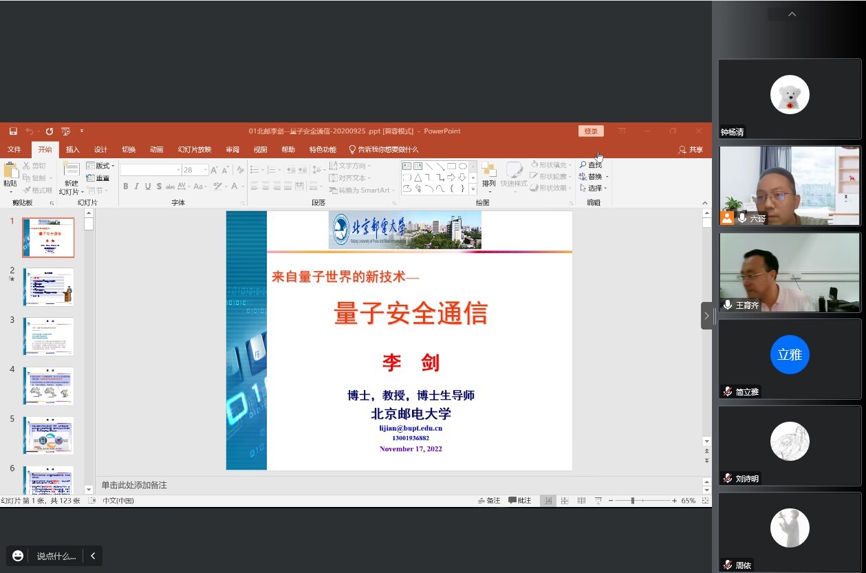 11月17日晚,北京邮电大学李剑教授应邀为公司师生做线上专题报告,报告题目为“量子安全通信”,本次报告由公司王育齐副教授主持。