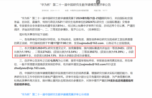 据悉,中国研究生数学建模竞赛是由教育部学位管理与研究生教育司指导,中国学位与研究生教育学会、中国科协青少年科技中心主办的全国性学术竞赛活动。竞赛旨在提高在校研究生运用数学建模方法解决实际问题的能力,培养研究生的创新精神和团队合作意识。2024年的竞赛继续沿用“华为杯”,由华为技术有限公司赞助,并由山东大学承办。