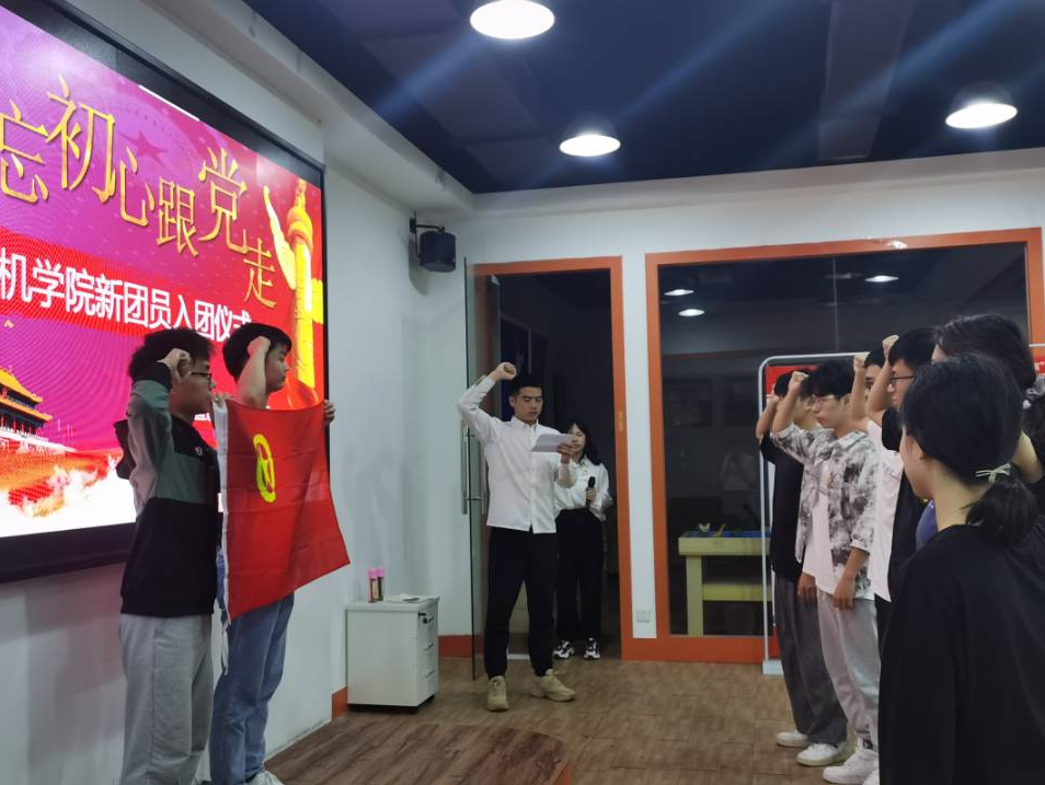 全体新团员面对团旗,右手握拳,在团旗下庄严宣誓:我志愿加入中国共产主义青年团,坚决拥护中国共产党的领导,遵守团的章程,执行团的决议,履行团员义务,严守团的纪律,勤奋学习,积极工作,吃苦在前,享受在后,为共产主义事业而奋斗。