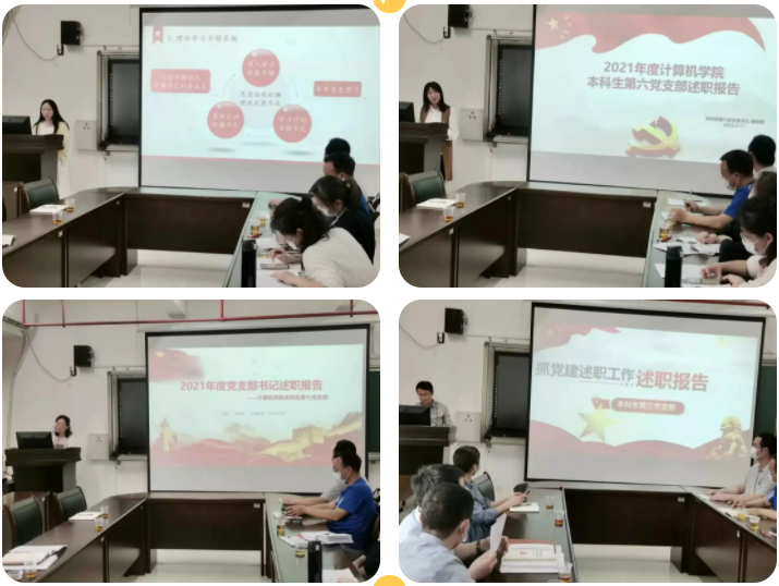 祁超代表公司党委作点评并讲话。他指出,过去的一年,公司各党支部书记担当务实,认真履行抓党建工作责任,着力抓规范、补短板、创特色,扎实推进党建与思政、党建与事业发展融合共进,取得显著成效。祁超强调,2022年是党的二十大召开之年,也是公司的“提质增效行动年”,抓好新一年的党建各项工作意义重大。各支部书记切实增强历史使命感和工作责任感,继续肩扛责任再出发,认真落实《中国共产党党支部工作条例(试行)》,完善工作思路,强化问题导向,抓好问题整改,推动党支部建设全面提质增效。一是要进一步把加强思想政治建设与强化行为示范引领结合起来,持之以恒加强习近平新时代中国特色社会主义思想学习,着力提升党员理论素养、党性修养和服从大局的水平,加大示范引领力度,引导教师党员争做教书育人的模范、员工党员争做成长成才的榜样;二是要进一步把完成规定动作与创新自选动作结合起来,严格落实“三会一课”、主题党日活动,立足各支部人员结构和计算机专业特点,创新支部组织生活的形式和内容,激发支部活动内生动力和创新活力;三是要进一步把支委分工与集体协作结合起来,充分发挥支部委员的主动性,建立健全支部委员工作职责清单,注重发挥党员各自所长,坚持重大工作集体协作的优良传统,切实把支部班子建好建强。